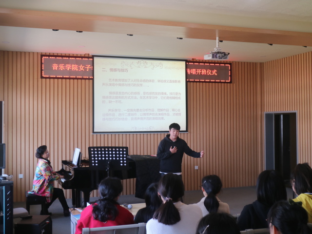 讲座中,陈教授指出学习艺术的重要性:艺术学习是阳光、空气和水,能增加对生命感的体验。音乐艺术,琴棋书画,是学生们情商提高和完整人格形成的主要途径。接着她又讲述了情感和声乐技巧的关系,在艺术学习中,它们是相辅相成缺一不可的。陈教授强调:声乐的学习首先要注意分析作品的背景,理解作品的含义,其次在方法上要控制好歌唱位置,最后要注意仪表仪态,结合自己对作品的理解进行二次创作,以情带声地去演唱作品,才能情感与技巧巧妙结合,获得声情并茂的演唱效果。她以《白毛女》为例,让学生现场感受情感和技巧的巧妙结合。最后,她邀请三位学生上台给大家做了实践教学示范,让学生们切身感受声乐歌唱艺术的魅力。