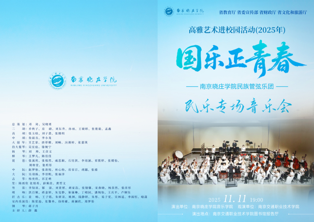 2025年11月11日晚7时,南京晓庄学院音乐学院民乐团走进南京交通职业技术学院,在该校图书馆报告厅成功举办了由省教育厅、省委宣传部、省财政厅、省文化和旅游厅主办的“高雅艺术进校园”民族管弦音乐会。此次活动是两校深化美育合作、推动文化育人的重要实践,为交通职业技术学院师生带来了一场极具感染力的中华优秀传统文化视听盛宴。