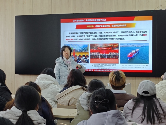 党课中,顾校长围绕党的二十届四中全会重大意义、目标原则与战略要点展开系统阐释。她指出,全会于中华人民共和国成立76周年、全面开启“十五五”规划新征程的关键节点召开,科学研判国内外发展大势,审议通过的《中共中央关于制定国民经济和社会发展第十五个五年规划的建议》,是指导中国式现代化建设的纲领性文件。全会强调统筹国内国际两个大局、发展和安全、质的有效提升和量的合理增长,凸显了系统观念与辩证思维,为应对复杂局面、破解发展难题提供了根本遵循。