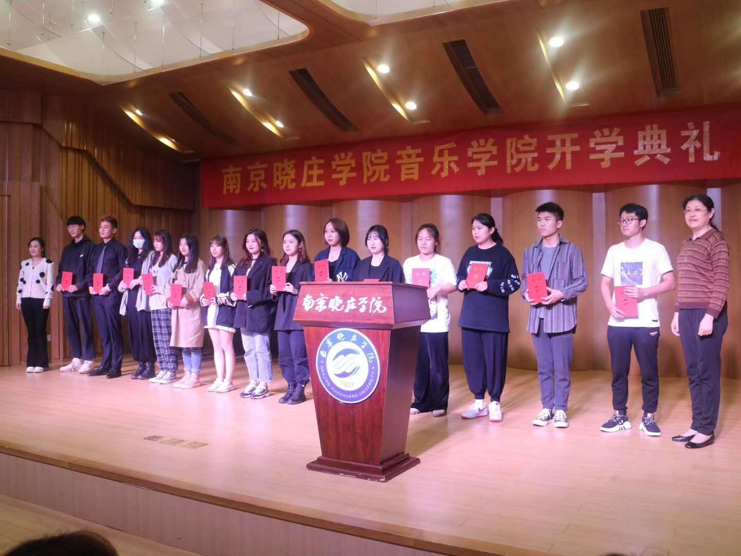 典礼在庄严的国歌声中拉开帷幕。吴晓勇院长代表学院全体师生对2020年入学的160名新生表示热烈的欢迎。他简要介绍了晓庄学院以及音乐学院的办学历史和发展成就,并寄语新生要坚持艺术的初心,学会自主学习、学会做人、积极维护身心健康,努力使自己成为更加优秀的音乐人才。教师代表高见老师就如何度过大学生活,与同学们分享了三点感悟:认真对待学业,日积月累,方可积跬步以至千里;践行陶行知老校长的爱满天下的教育理念,保持善良之心,用爱换取别人的信任;知行合一,勇于实践,坚持练琴、阅读,丰富个人的学习生活。2017级音乐学师范一班赵恒毅同学是今年国家奖学金获得者,在江苏省高校音乐教育专业大学生基本功展示比赛中获得团体一等奖、个人全能一等奖等荣誉。作为老生代表他分享了自己的大学经历和未来规划,鼓励同学们珍惜时光,尽早进行个人规划,勤奋学习,不给青春留下遗憾,并表达了对老师和领导悉心指导的感谢。新生代表罗静则表达了她对美好大学生活的期望,经过了开学第一课军训的磨炼,未来的大学生活将更加有朝气活力。最后学院领导们为新生班主任及新生班主任助理颁发聘书,2020年音乐学院新生开学典礼在热烈的掌声中落下帷幕。