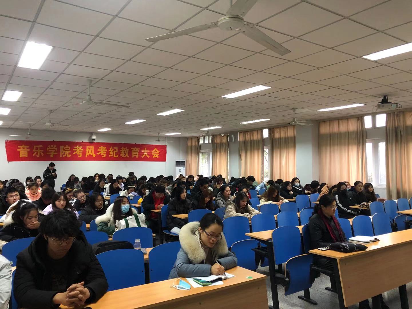为进一步加强考风考纪建设,营造公平公正的考试环境,树立严谨治学诚信考试的良好学风,12月29日中午,音乐学院在行知组团B11教室召开了考风考纪教育大会。大会由学工办副主任章洁主持,党总支潘红书记、副院长于晓晶以及2020级、18级专转本学生参加了大会。