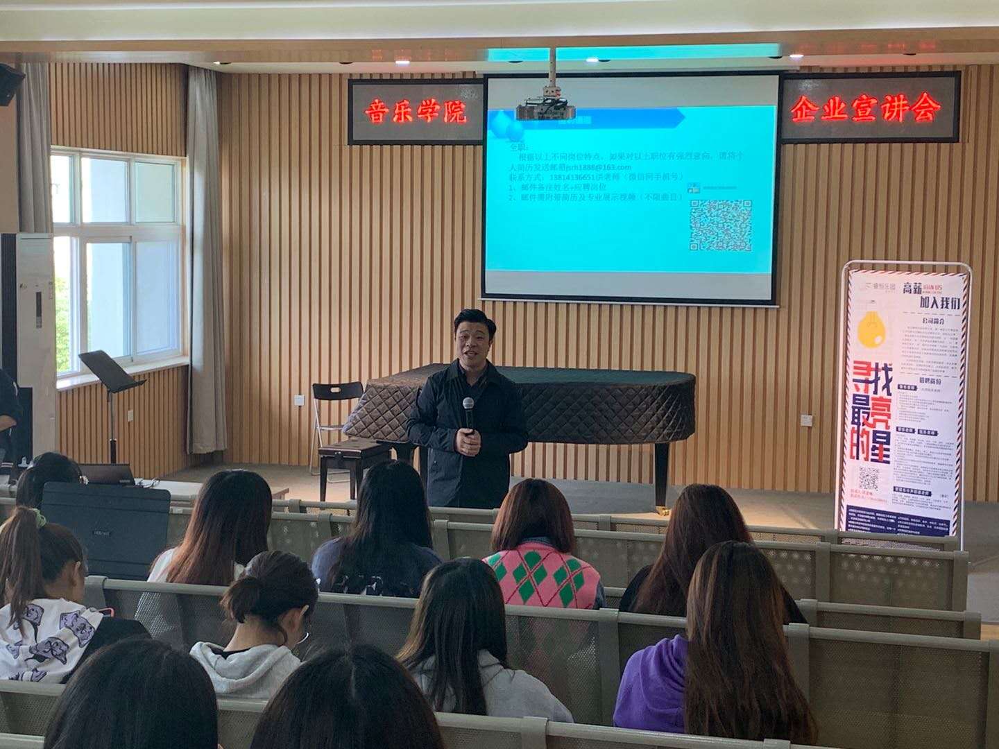 实习动员结束后,南京睿恒乐团有限公司人事经理洪成成老师做宣讲,她向毕业生们介绍了公司的概况、招聘岗位、员工的薪资福利、未来发展前景等,该公司总经理张龙老师告诉同学们,未来的发展需要有拼搏的精神,永远保持一颗谦虚的心,为自己的人生保驾护航。