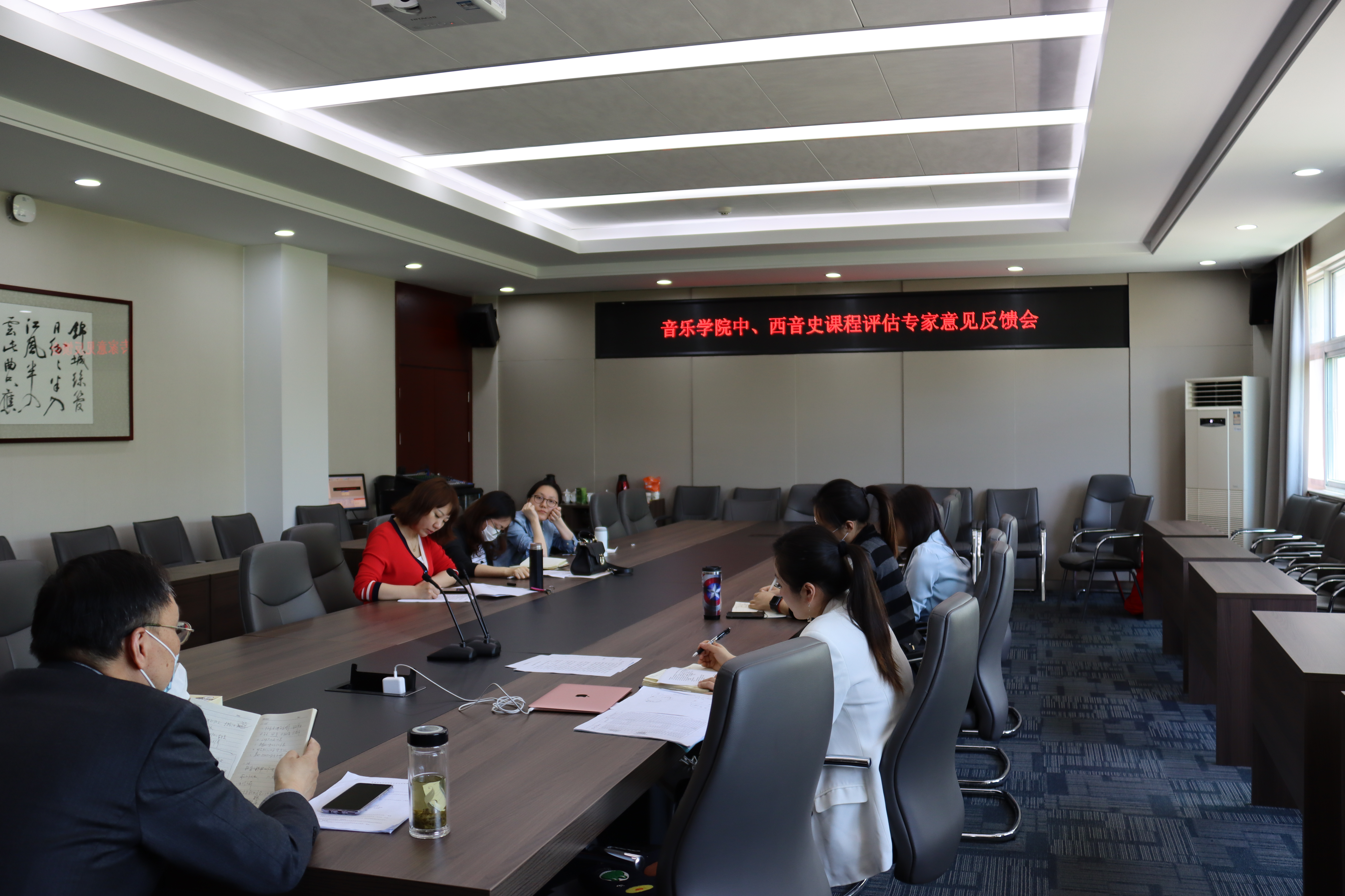 2020 年 5 月 12 日,有关中国音乐史、西方音乐史两门课程的课程评估专家意见反馈会在音乐学院 209 会议室召开。会议由于晓晶副院长主持,院长吴晓勇教授、潘红书记、教学委员会成员吴晓慷教授、教务办周新慧副主任、音乐理论教研室主任王洁老师及教研室王秀、胡畔、王艺蓓、叶姗姗等老师共同参与。