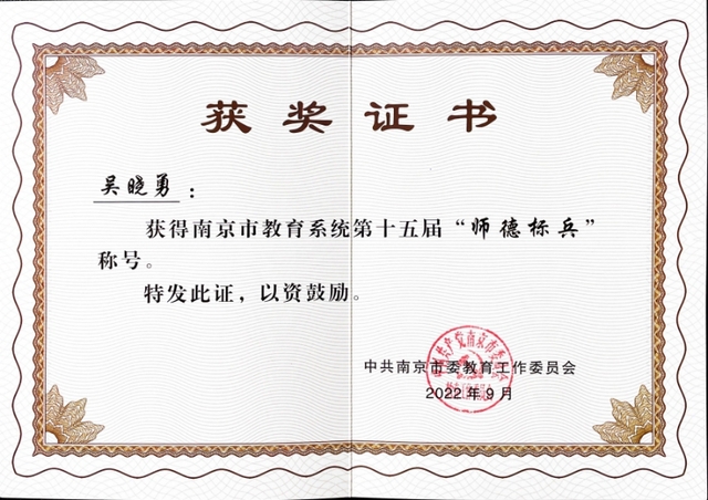南京市教育局近日公布了南京市教育系统第十五届师德先进集体和师德先进个人评选结果。我校音乐学院吴晓勇教授被授予南京市教育系统第十五届“师德标兵”称号。